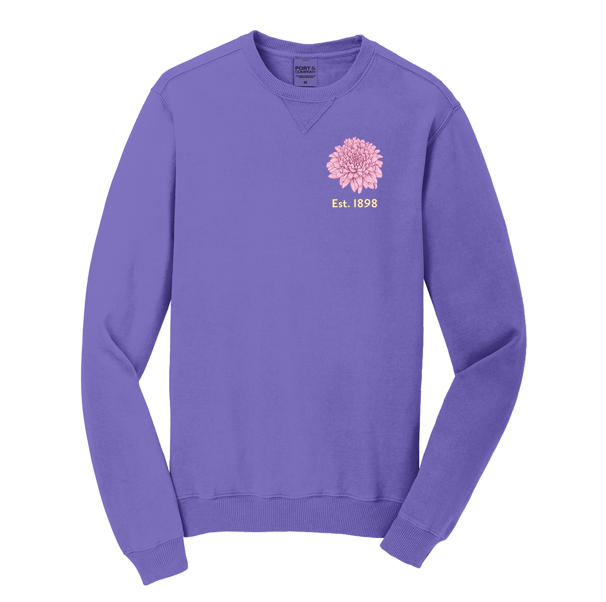 Pink Chrysanthemum left-chest design printed on a unique and incredibly soft crewneck with a worn-in, vintage look. Available in THREE colors! Perfect for Sweethearts, probationary members, partners, significant others, parents, or yourself!