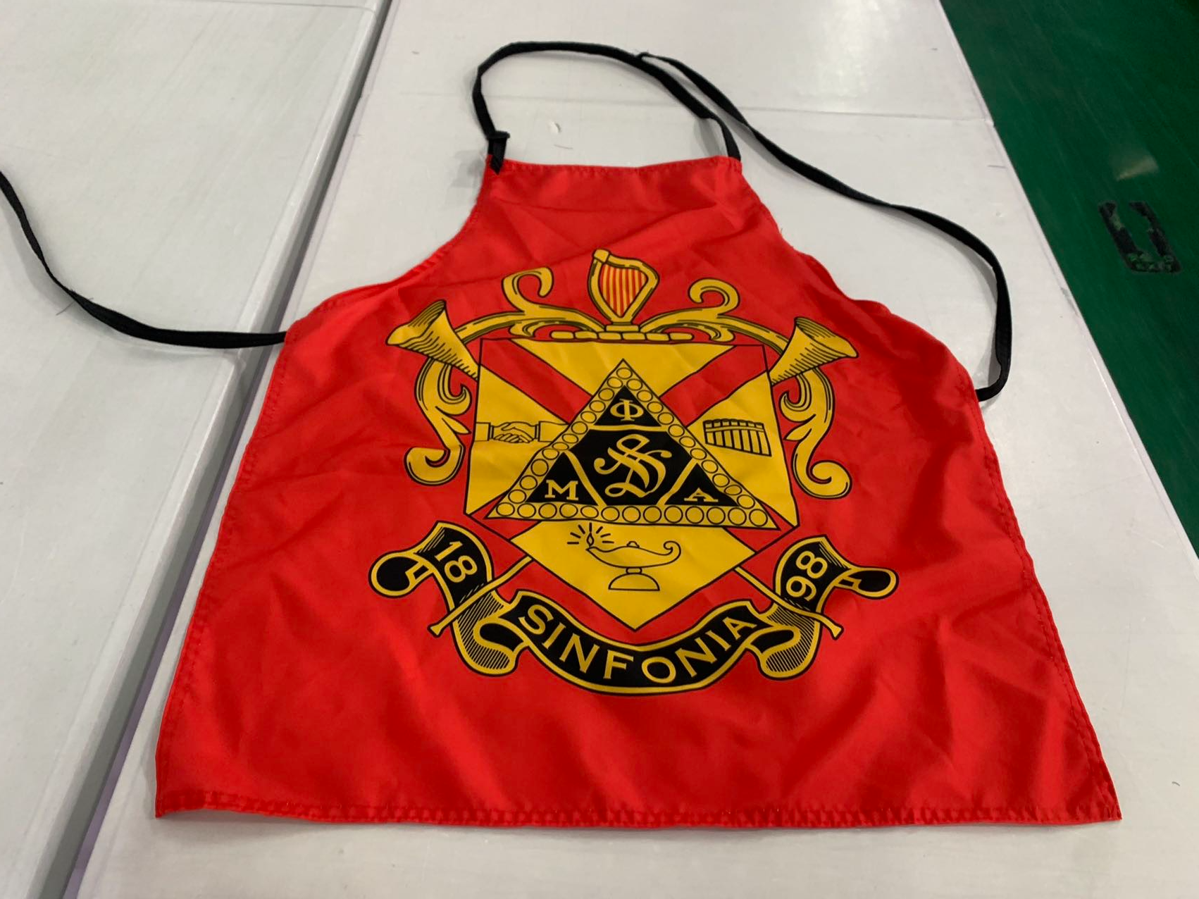 Full color apron featuring a large imprint of the coat of arms and black tie strings.