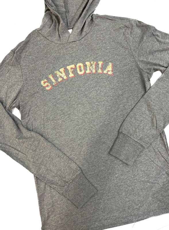 Limited Offering.... long sleeve, light-weight hoody gray t-shirt featuring a metallic gold and red "SINFONIA" imprint.