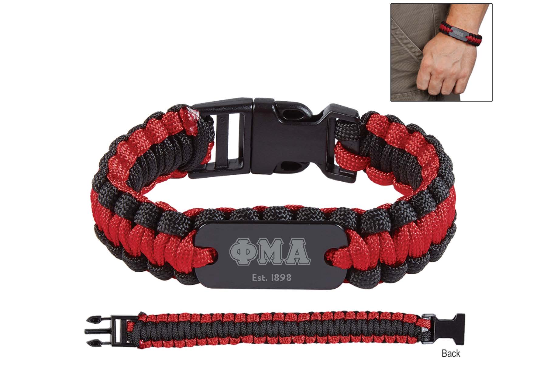 Stylish paracord bracelet with metal laser-engraved tag. Features over 9 feet of paracord material!